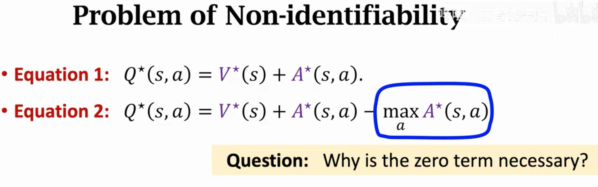 加了一个值为0的项。这个项似乎是多余的,但是它的意义是让学习\(V^\star\)和\(A^\star\)是唯一的。由于\(Q^\star\)是两个值的和,这两个值一个增大,另一个值减小,最后相加的和可以是不变的。也就是同一个值有不同的分解情况。由于\(V^\star\)和\(A^\star\)都是用神经网络估计的,这种不稳定性增大了训练难度,两个网络输出的改变反而可能有相同的总输出,增加了训练波动。