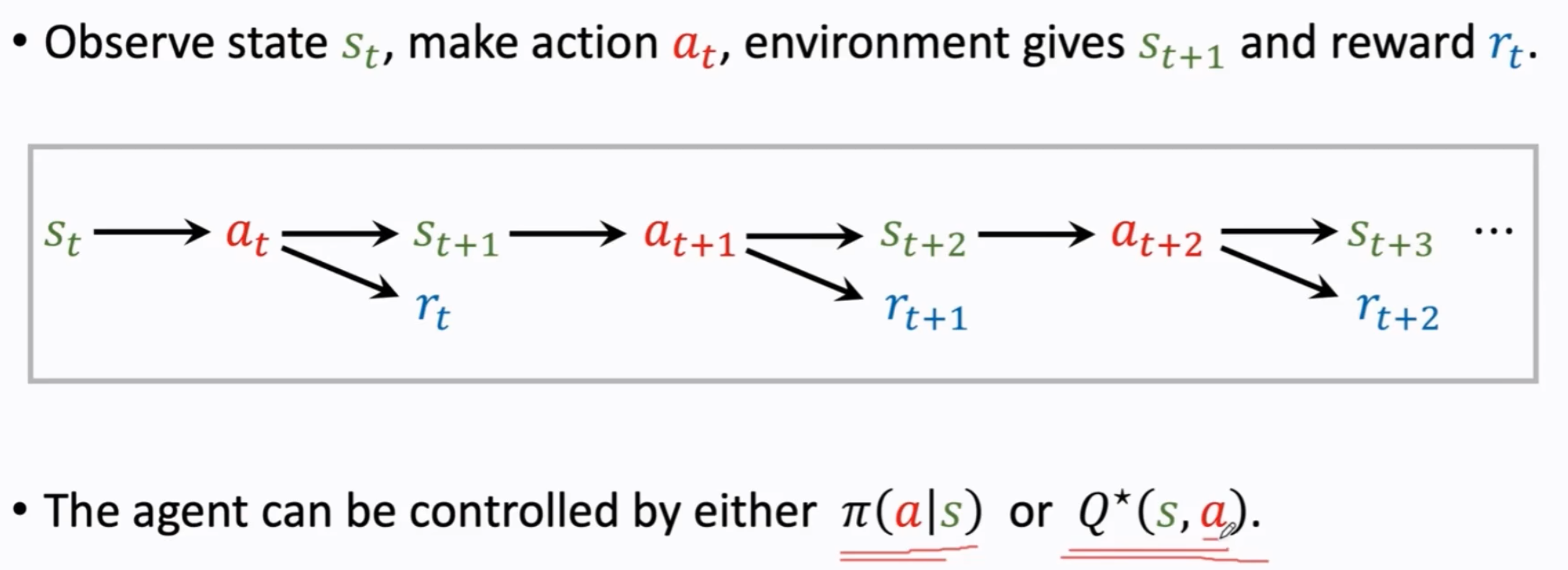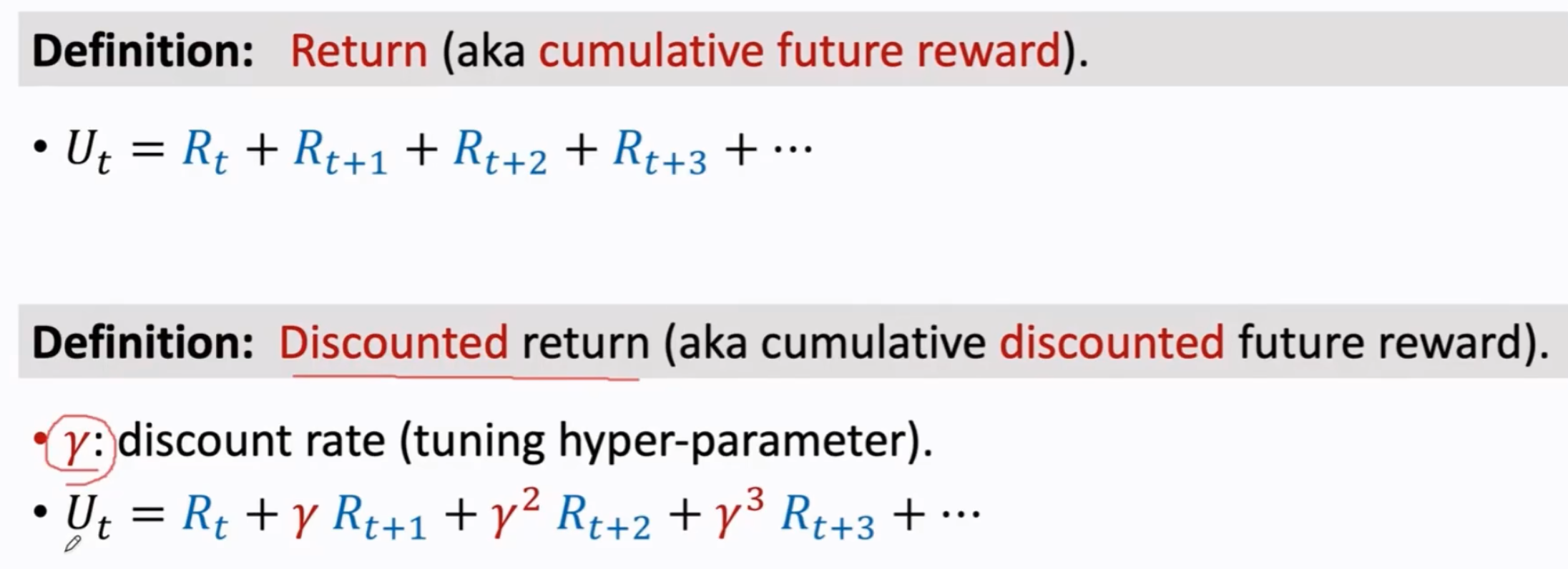 奖励是我们人类鼓励的方向,判断什么动作好,什么动作不好。强化学习的奖励常常是稀疏的,因为很多动作没有当下及时反馈的好与坏。例如游戏人物随机走一步,没有好坏。但是这个好坏可能是影响到了未来。因此,奖励常常使用accumulated reward(也叫做return,强化学习任务达到终止状态,可以计算累积奖励了)。