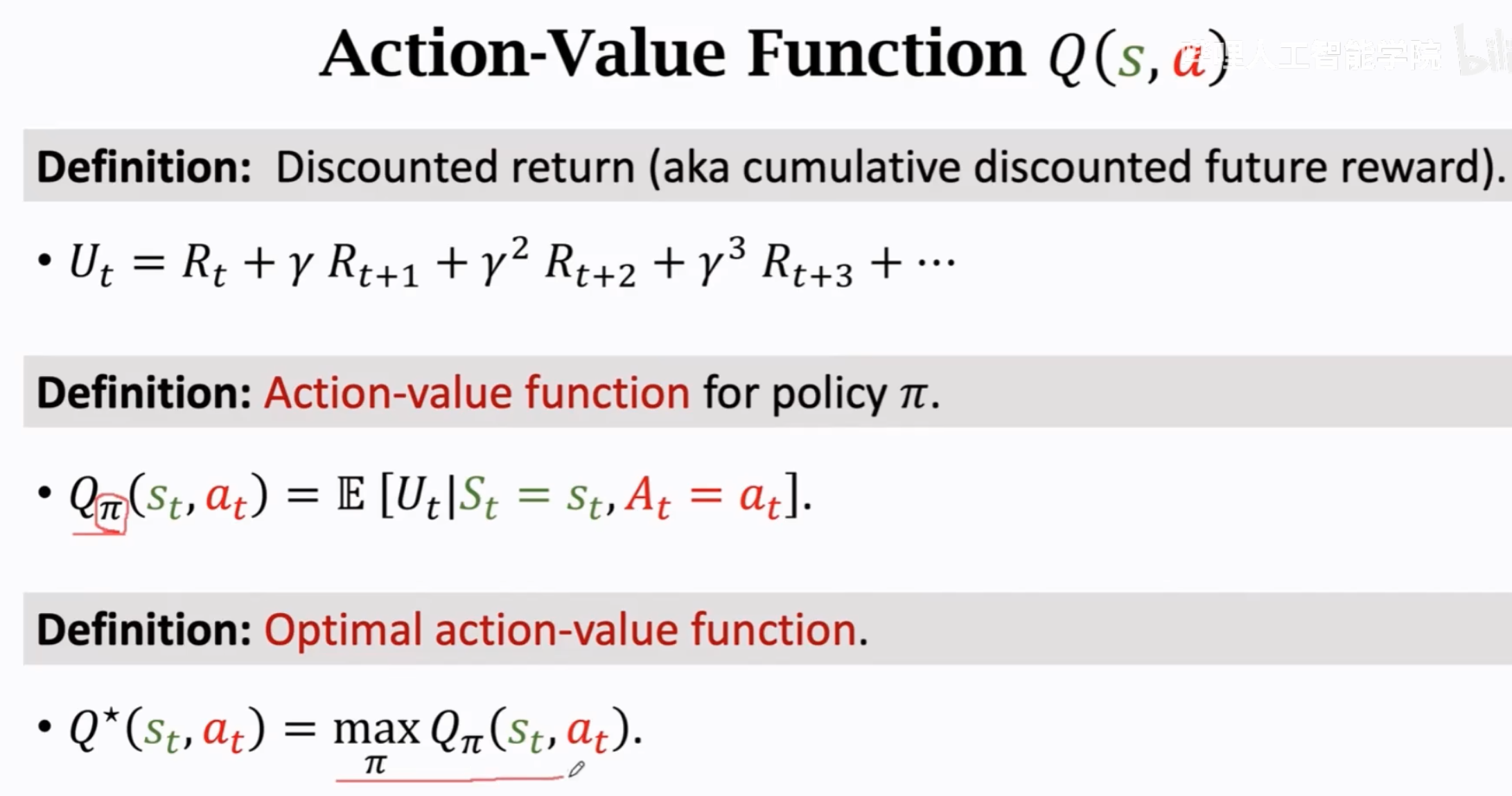 要通过利用action value来选择进行哪个动作,那么目的就是学习RL中的最优动作价值函数\(Q^\star(s_t,a_t)\)。最优动作价值函数存在是为了评估在无论policy function学习的好还是坏情况下,理论上能取得的最大的未来累积奖励的期望,也就是动作价值\(max_\pi Q_\pi (s_t,a_t)\)。期望奖励是某个policy在当前状态\(s_t\)采取动作\(a_t\)后,能够取得的预期未来累积奖励\(Q_\pi (s_t,a_t)=E(U_t|s_t,a_t)\)。