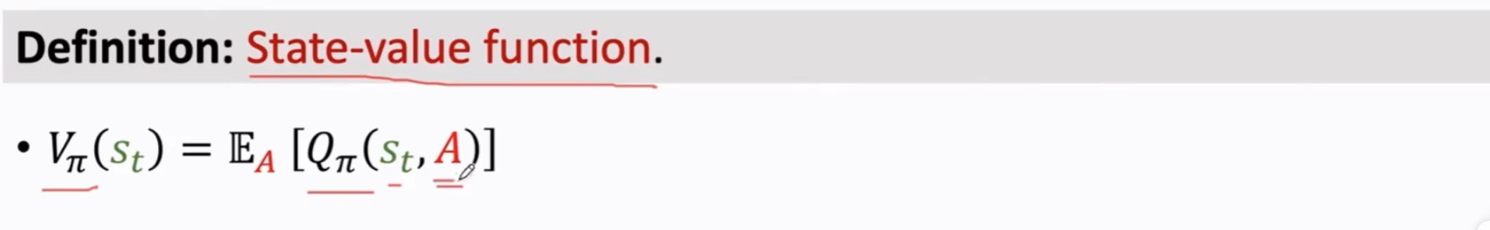 接下来,我们讨论价值函数的几个属性。首先存在定理: \[ V^\star(s_t) = max_a Q^\star (s_t,a_t) \] 为了证明这一点,可以推导: \[ V^\star(s_t) = max_\pi V_\pi(s_t) \\ = max_\pi E_{a_t\in A}(Q_\pi(s_t,a_t)) \\ = max_\pi \sum_{a\in A} \pi(a_t|s_t) Q_\pi(s_t,a_t) \] 继续推理, \[ max_\pi \sum_{a\in A} \pi(a_t|s_t) Q_\pi(s_t,a_t) = max_\pi 1 \cdot max_a(Q_\pi(s_t,a_t))=max_a Q^\star(s_t,a_t) \] 直观的理解就是,Optimal state value就是找到理论上最大价值的那个动作,让它的出现概率是\(1\)。