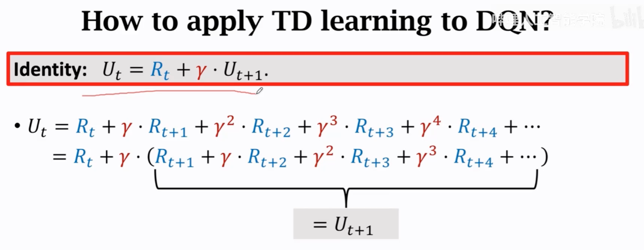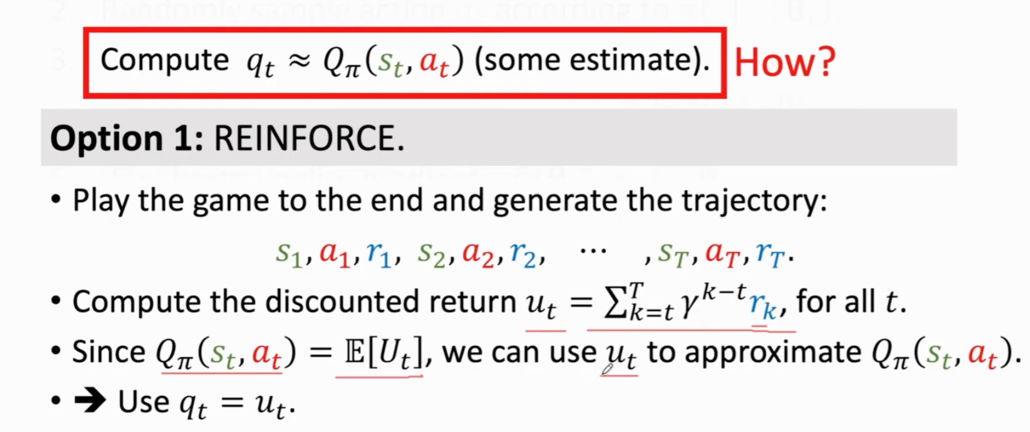 因为我们现在得到的TD target是一个累积未来奖励的期望,很难直接求。TD target的本质是加入了观察到的奖励后对当前价值的估计。所以可以用后面小节里介绍的蒙特卡洛方法进行估计。这里蒙特卡洛方法估计相当于是仅抽样一次:
