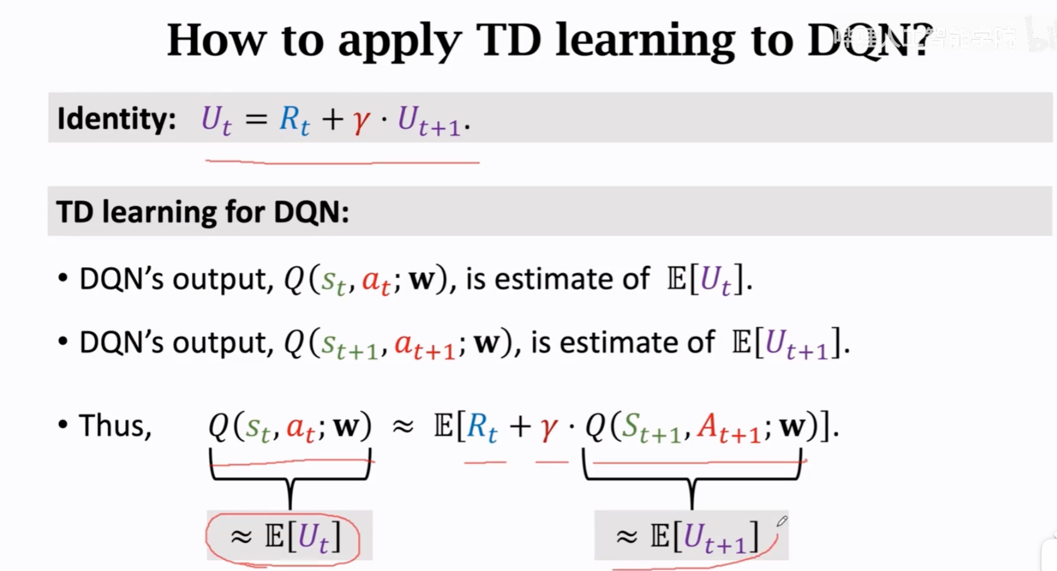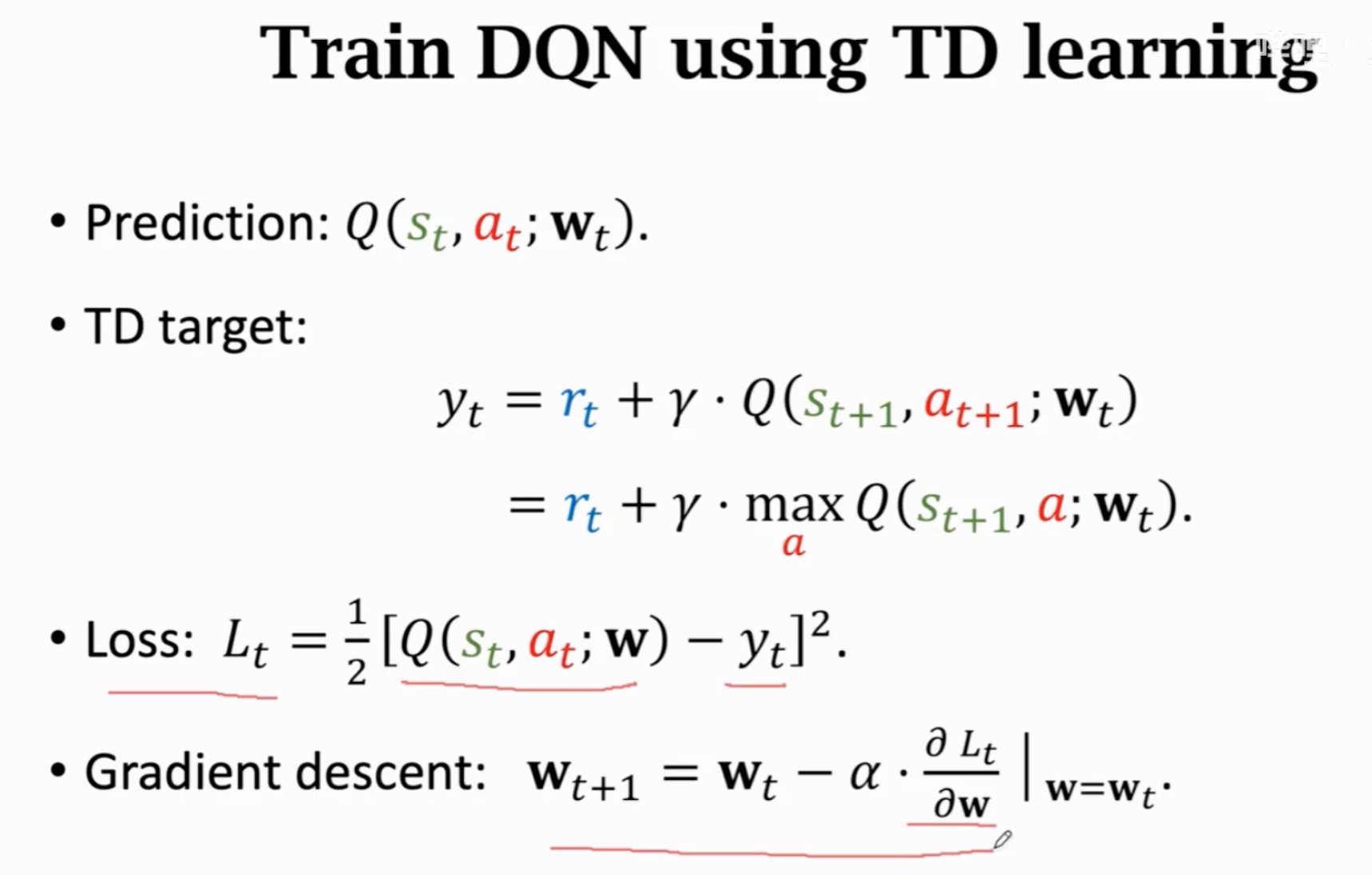 - reward \(r_t\)与\(max_a Q(s_{t+1},a;\mathbf{w}_t)\)是TD target,\(Q(s_t,a_t;\mathbf{w_t})\)应该和其相等。计算loss,最后梯度下降,更新Q网络。