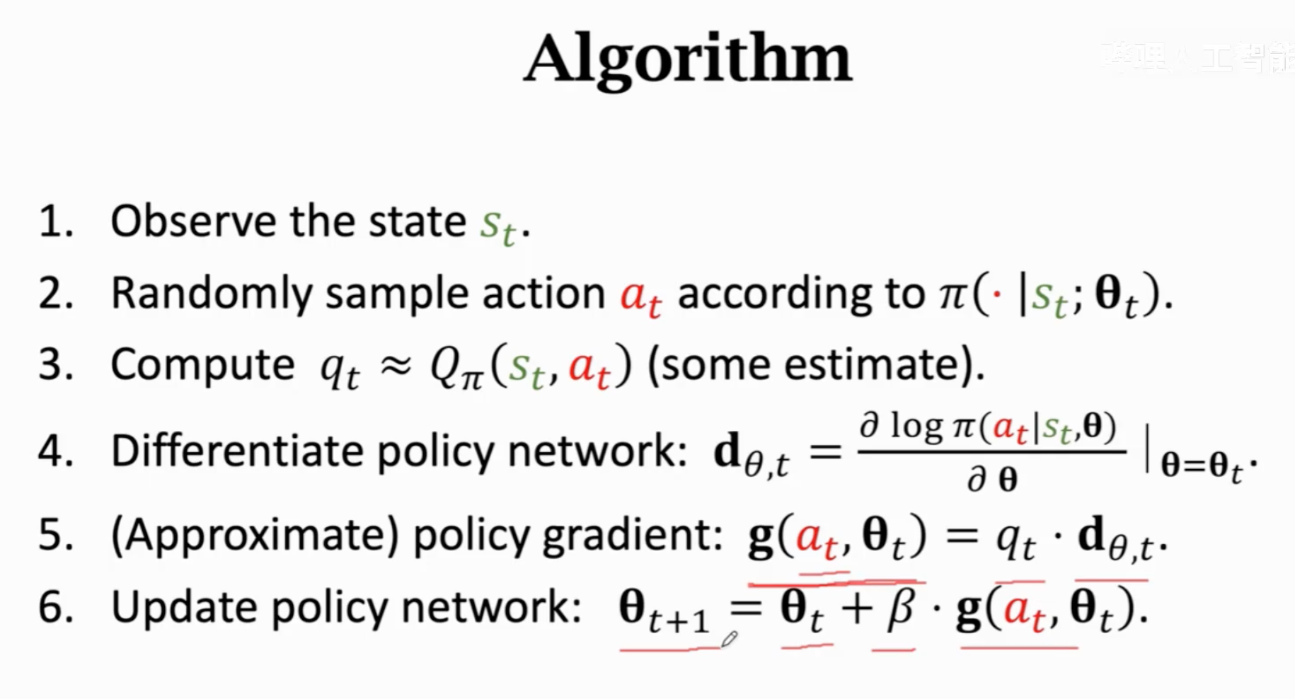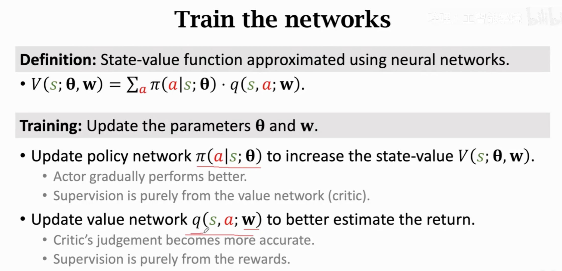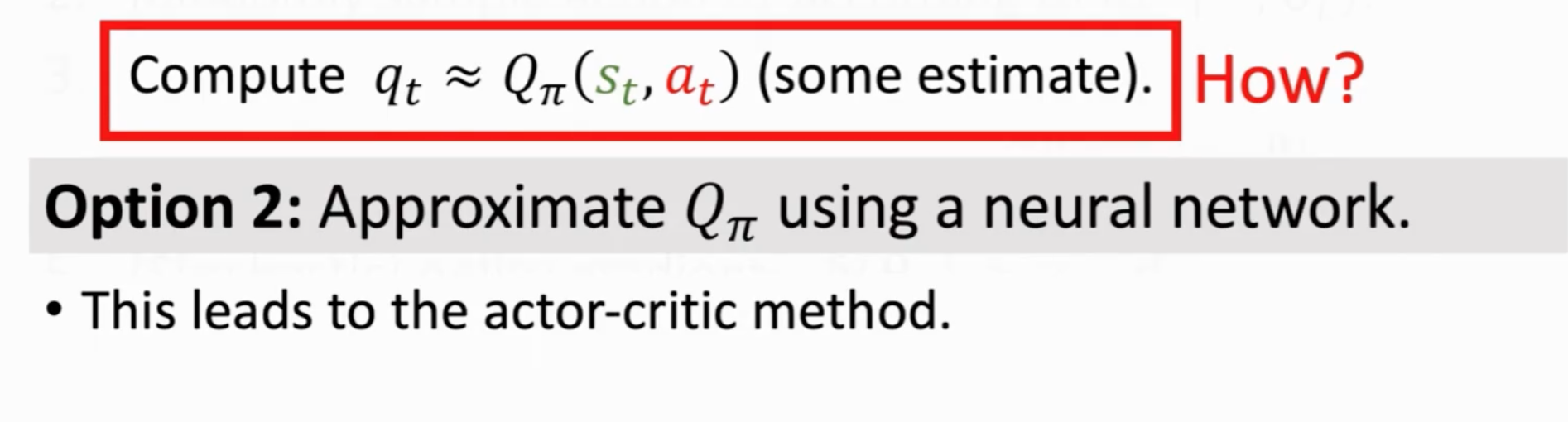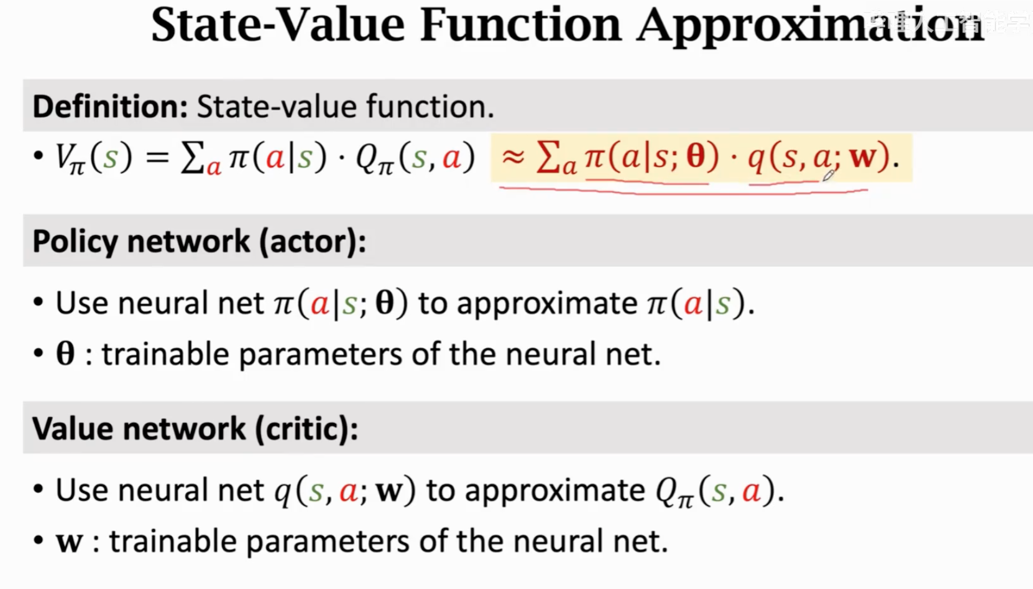 为了减轻这一负担,一个直接的想法就是能不能不需要完整的采样整个epside就可以估计action value。value learning就刚好可以用在这个地方。我们直接引入一个价值网络来估计action value function,这样只要每次policy输出新的action \(a_t\),动作价值网络就可以直接给出一个估计值,用来计算policy gradient。