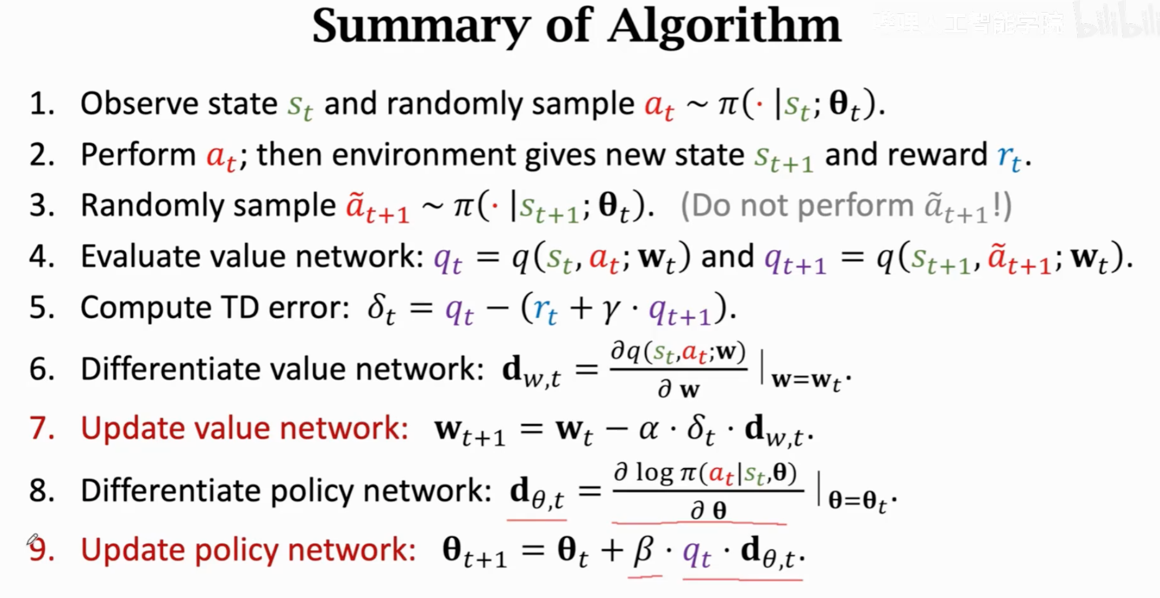 注意上面也出现了类似于TD target的\(y_t\),这不过这里的TD target既不同于SARSA算法(计算动作价值)也不同于Q-Learning算法(计算最优动作价值)。这里的TD是指计算两个状态价值之间的TD。更新value network需要使用TD算法: