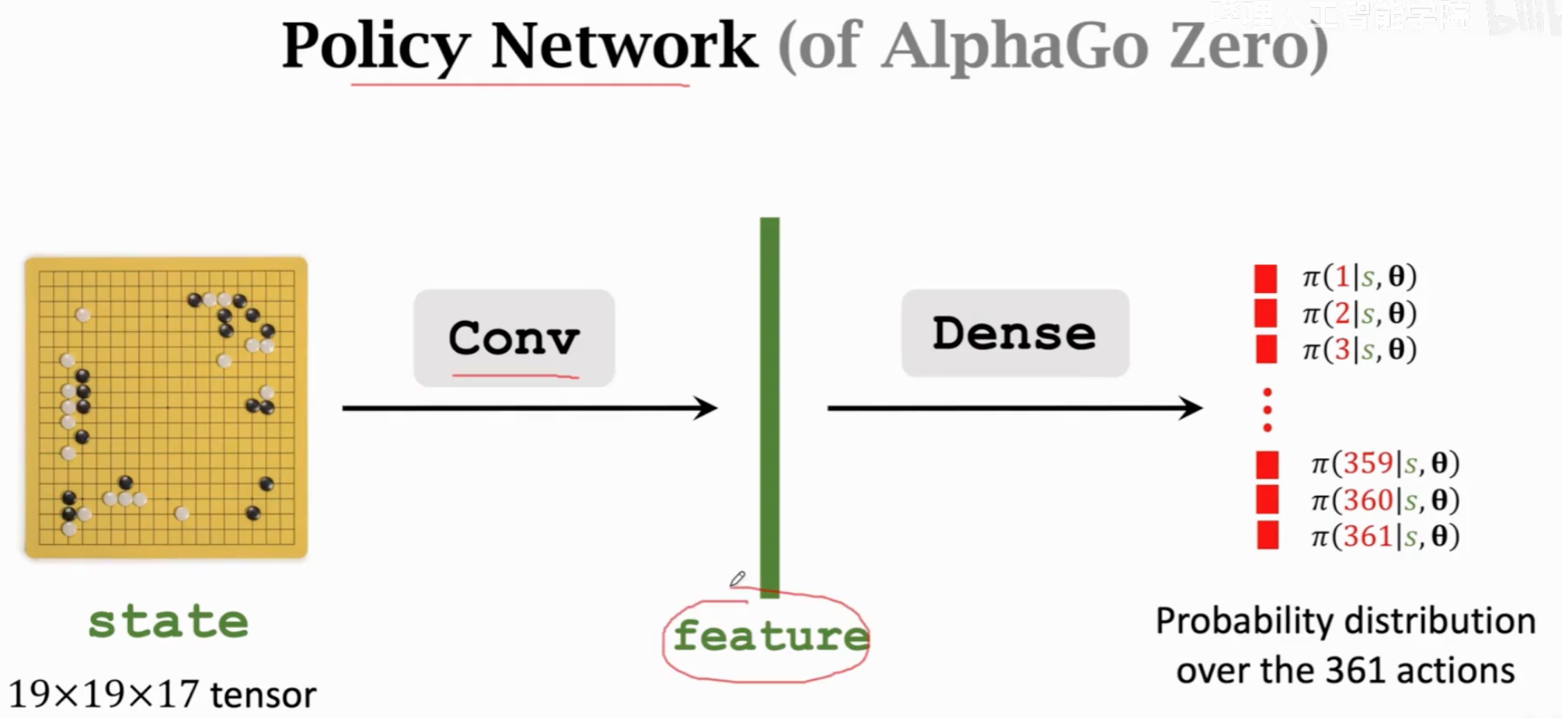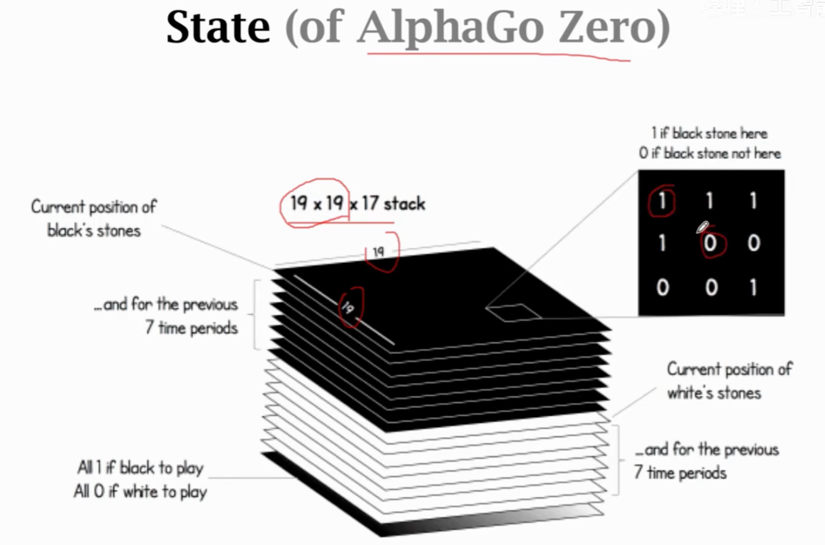 AlphaGo zero的state是19x19x17的张量(8个矩阵代表黑子在前7局的落子和当前局的落子,在哪里有黑子就是1,否则都是0;8个矩阵代表白子在前7局的落子和当前局的落子;还有一个矩阵全是1代表当前落黑子,全是0代表当前落白子)。