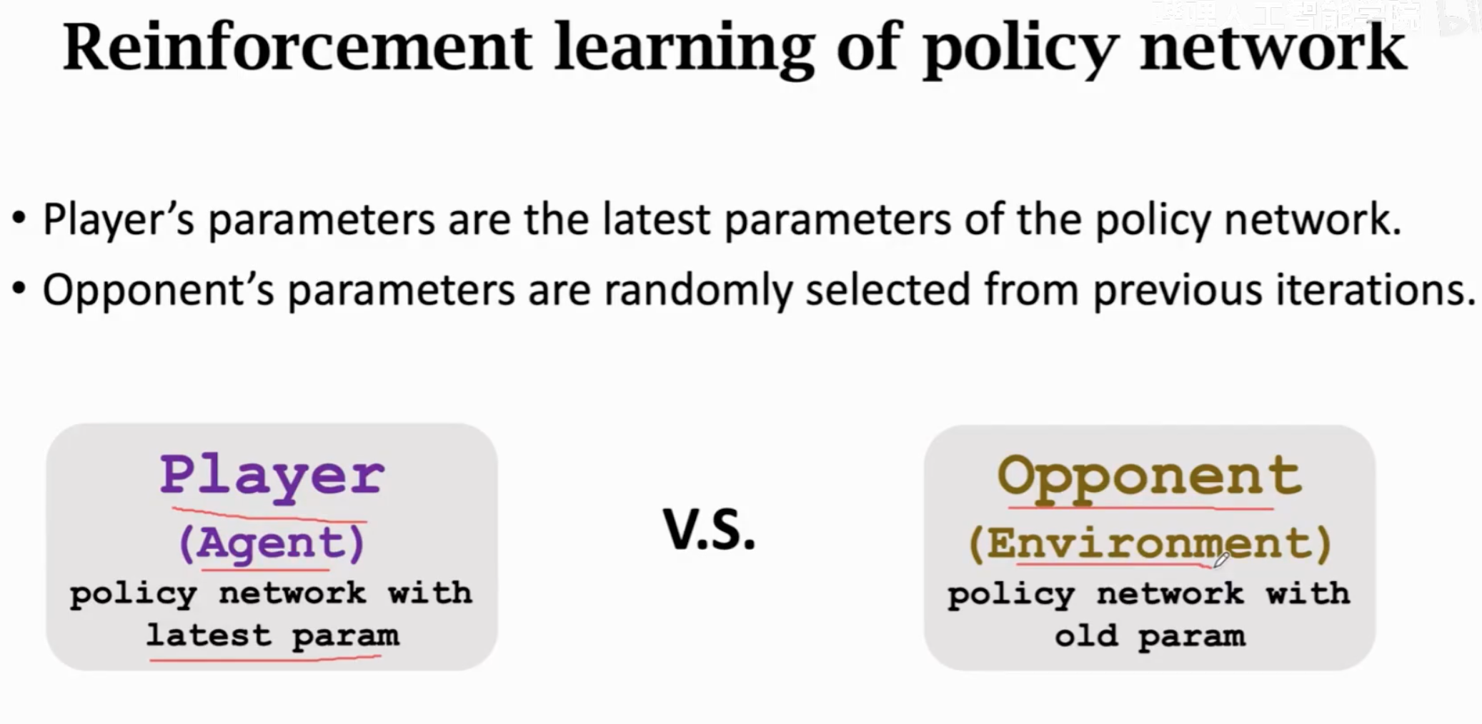 然后第二阶段,自己和之前的自己下棋,借助RL让policy学会自己根据不同的state去决策,而不是仅仅只能应对前一阶段见过的state: