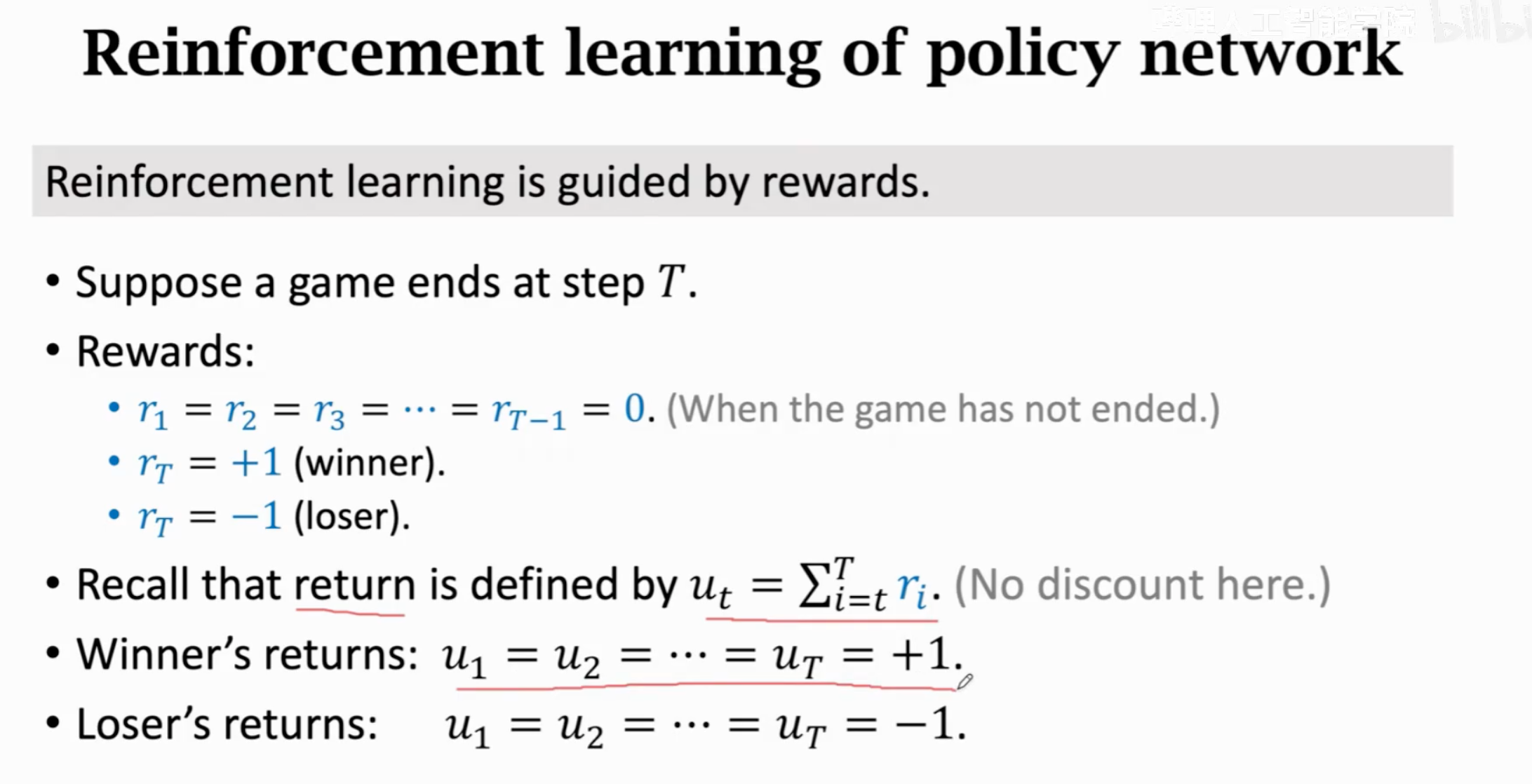 奖励的设置就是最后赢了(\(+1\))还是输了(\(-1\)),中间每一步的奖励是0,那么累积奖励要么都是\(1\)要么都是\(-1\)。因为只有最后一步才有奖励,所以没有discount factor。