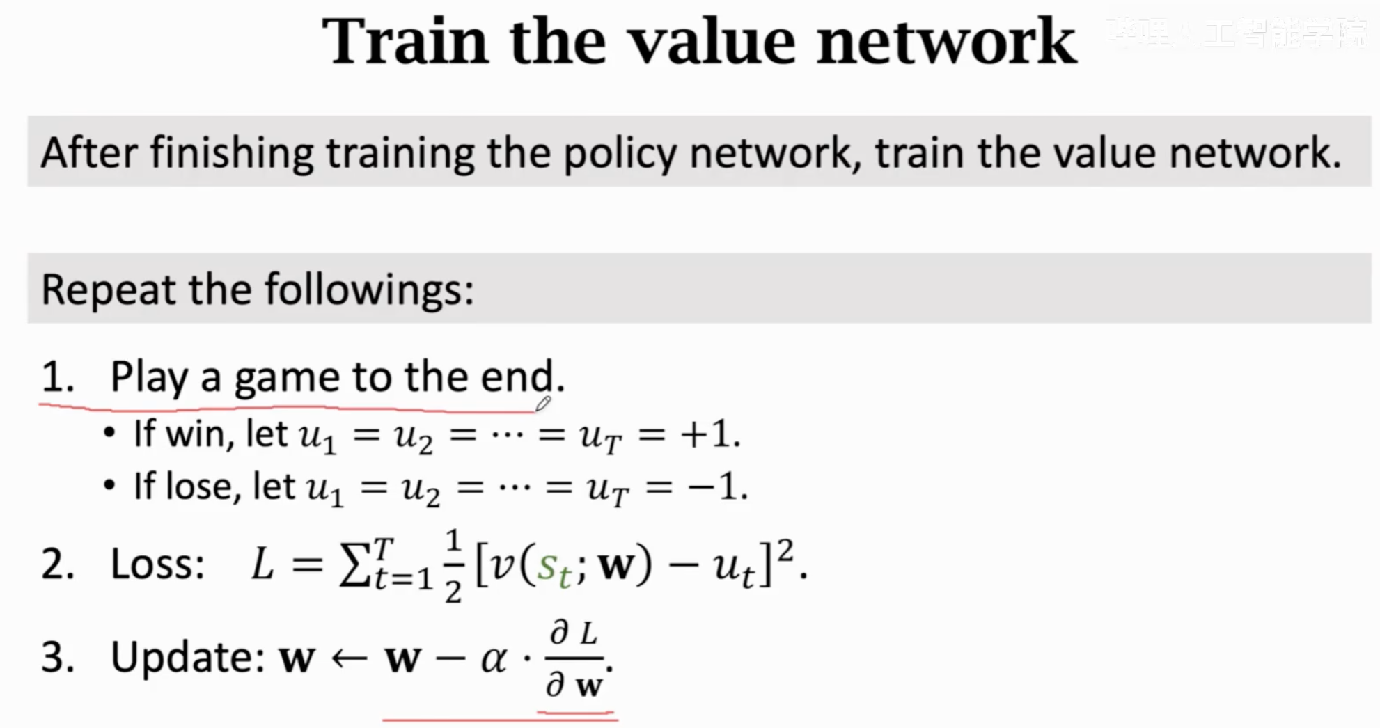第三个阶段是借助于训练好的policy network,训练一个价值网络。但是和一般的DQN( \(Q^\star(s_t,a_t)\))和actor-critic方法(\(Q_{\pi}(s_t,a_t)\))里的value network估计的是action value function不同,这里的价值网络是直接估计state value function \(V_\pi(s_t)\),评估当前局势的好坏。
