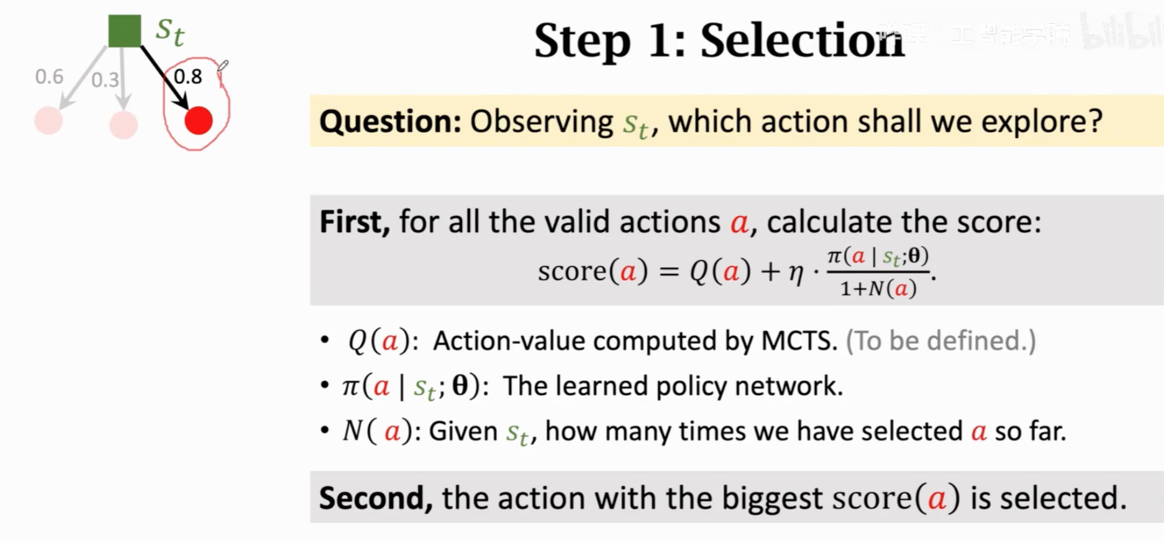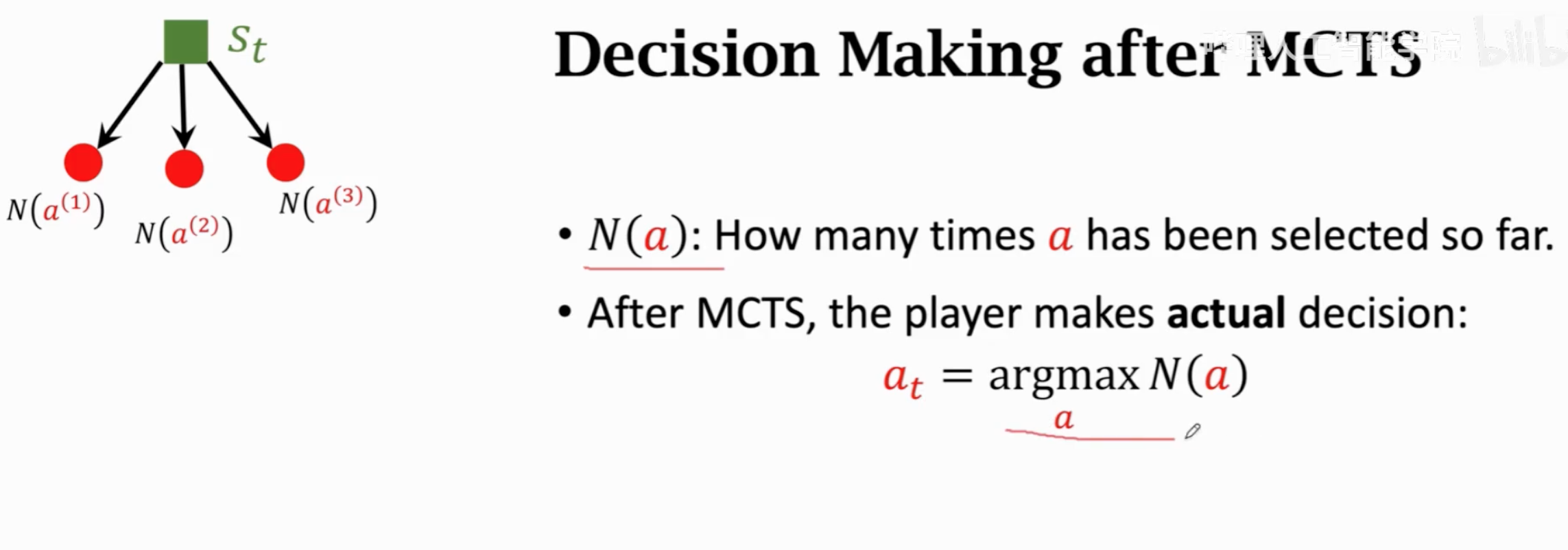 前面四步重复成千上万次,选择被选中次数最多的那个动作作为真正的下一步动作: