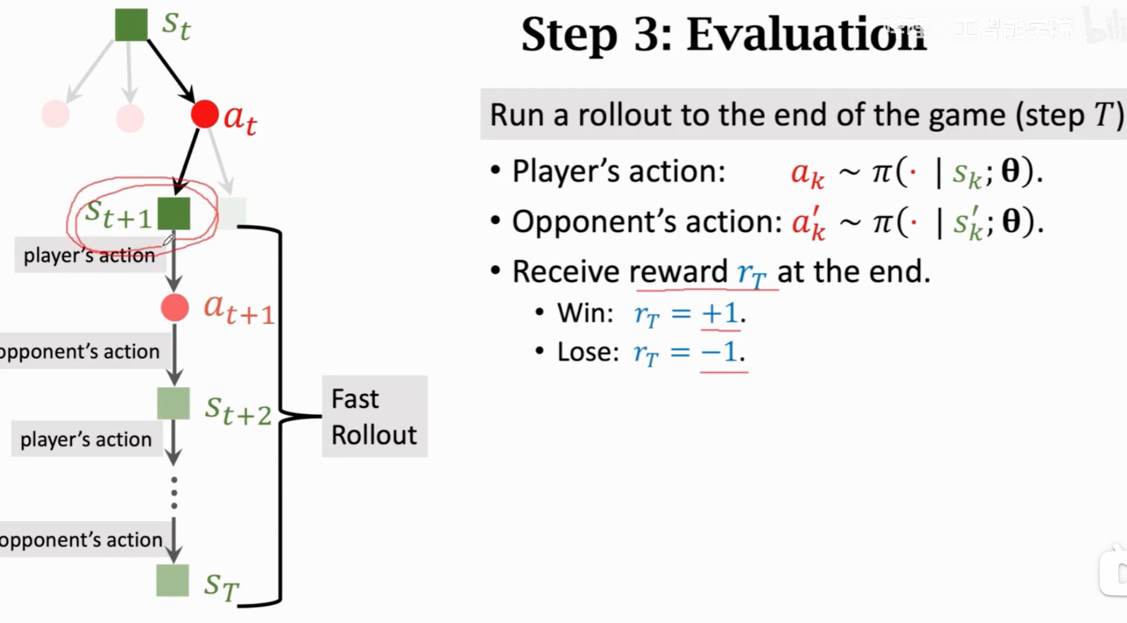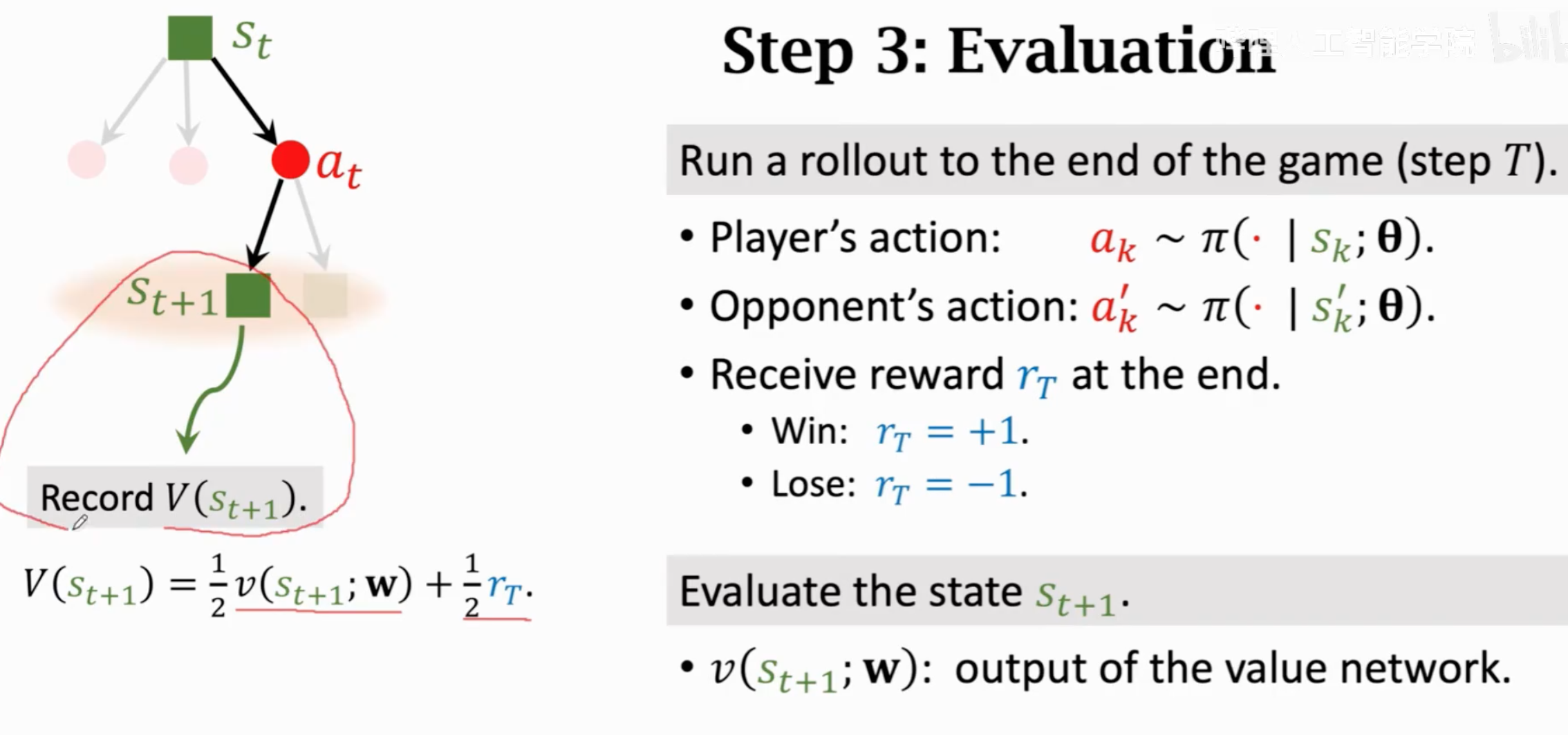 第三步是评估,用policy自己和自己下,直到最终比赛结束获得奖励。同时也直接用value network估计当前的局势。