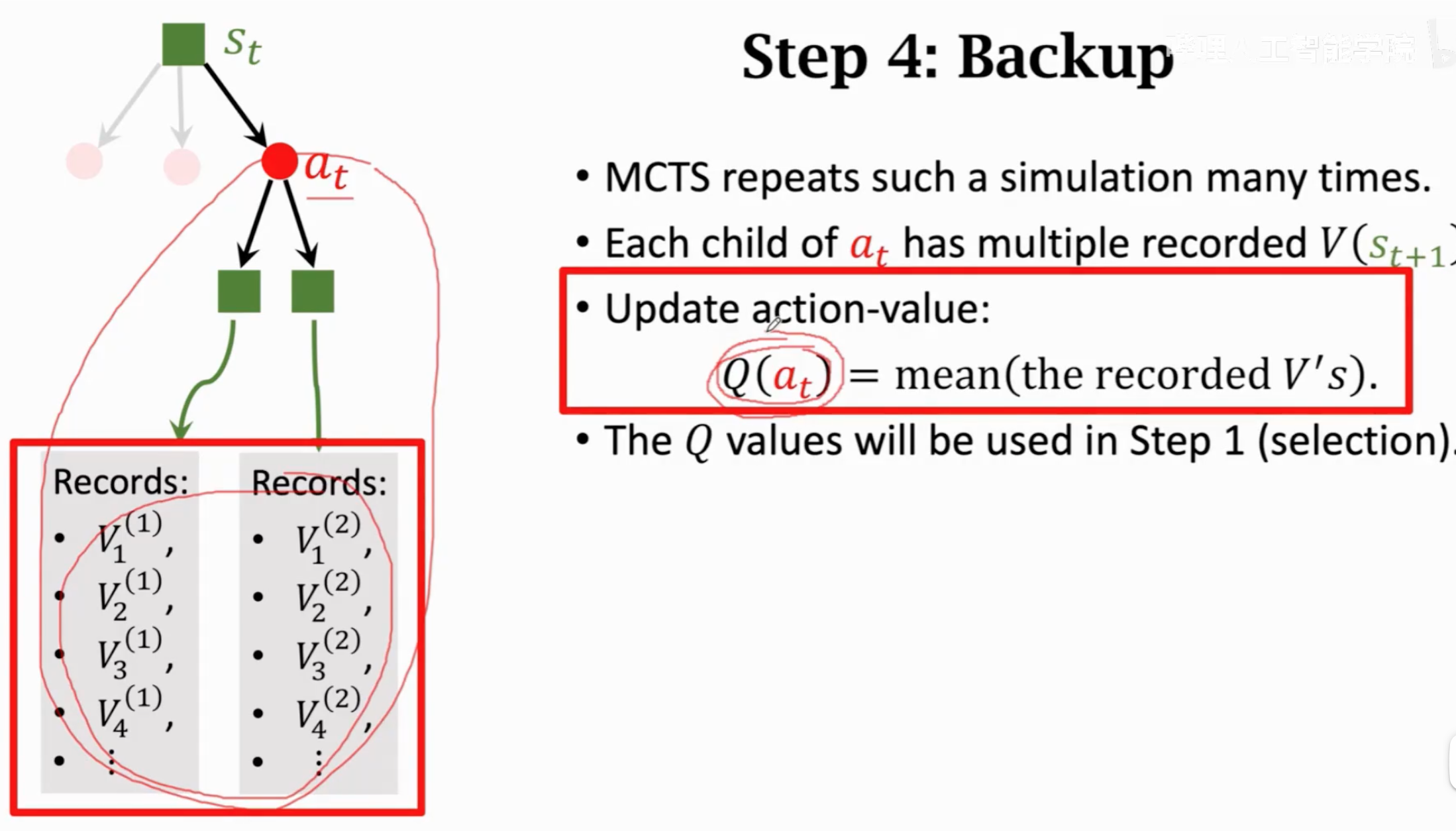 第四步是回溯,根据第三步的奖励和价值,更新动作价值得分\(Q\):