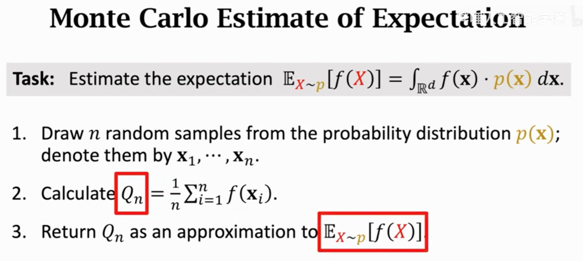 在上面求积分的过程中,我们假设抽样在输入区间内是完全等概率随机的。但是输入的变量完全可能是某个概率,这时我们只需要随机抽样的时候按照符合输入概率进行抽样即可。下面是用蒙特卡洛来估计期望的一般方法: