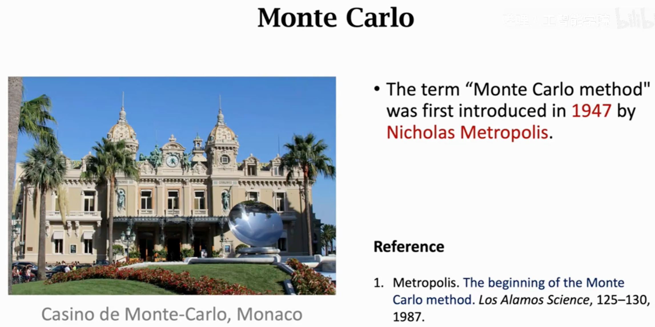 蒙特卡洛方法是一类用重复随机抽样来估计真实值的方法,有着广泛的应用。“蒙特卡洛”这个名词是一个著名赌场,这个方法是由metropolis在1947年提出的。